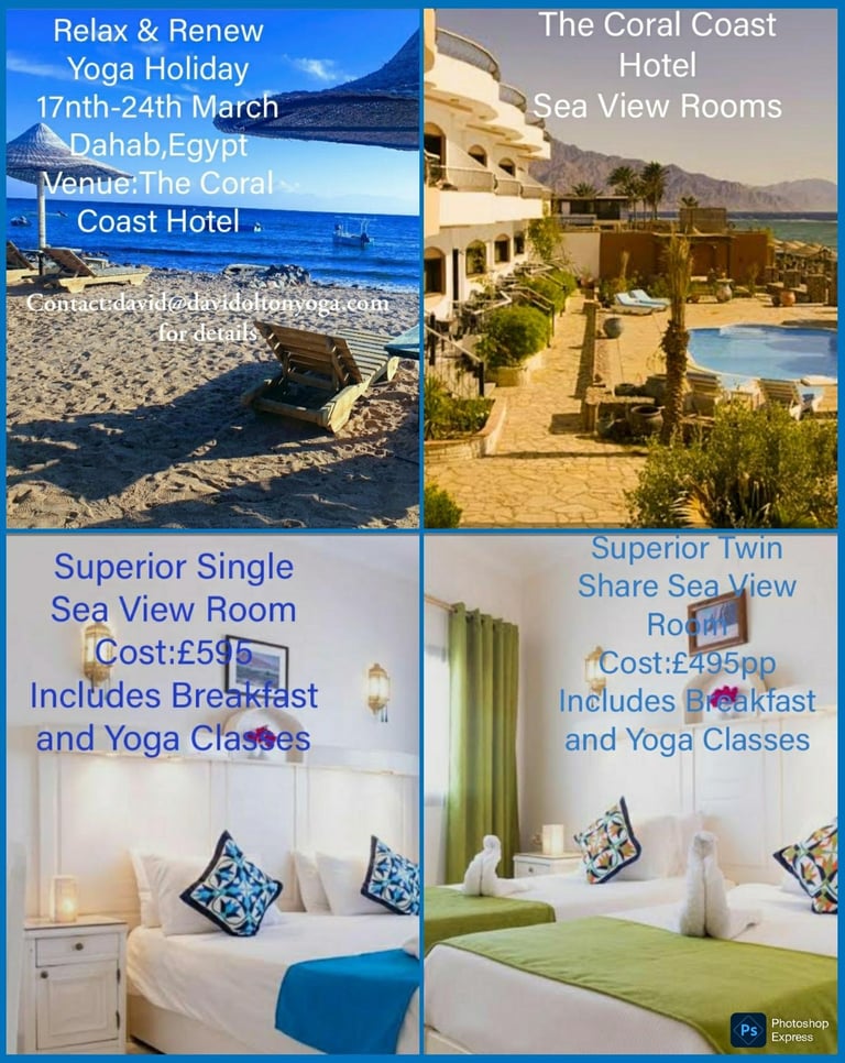 Relax & Renew Yoga Holiday in beautiful Dahab,Egypt March 17nth- 24th 2026..Superior sea view single and twin share rooms available.Price includes two classes a day and breakfast.